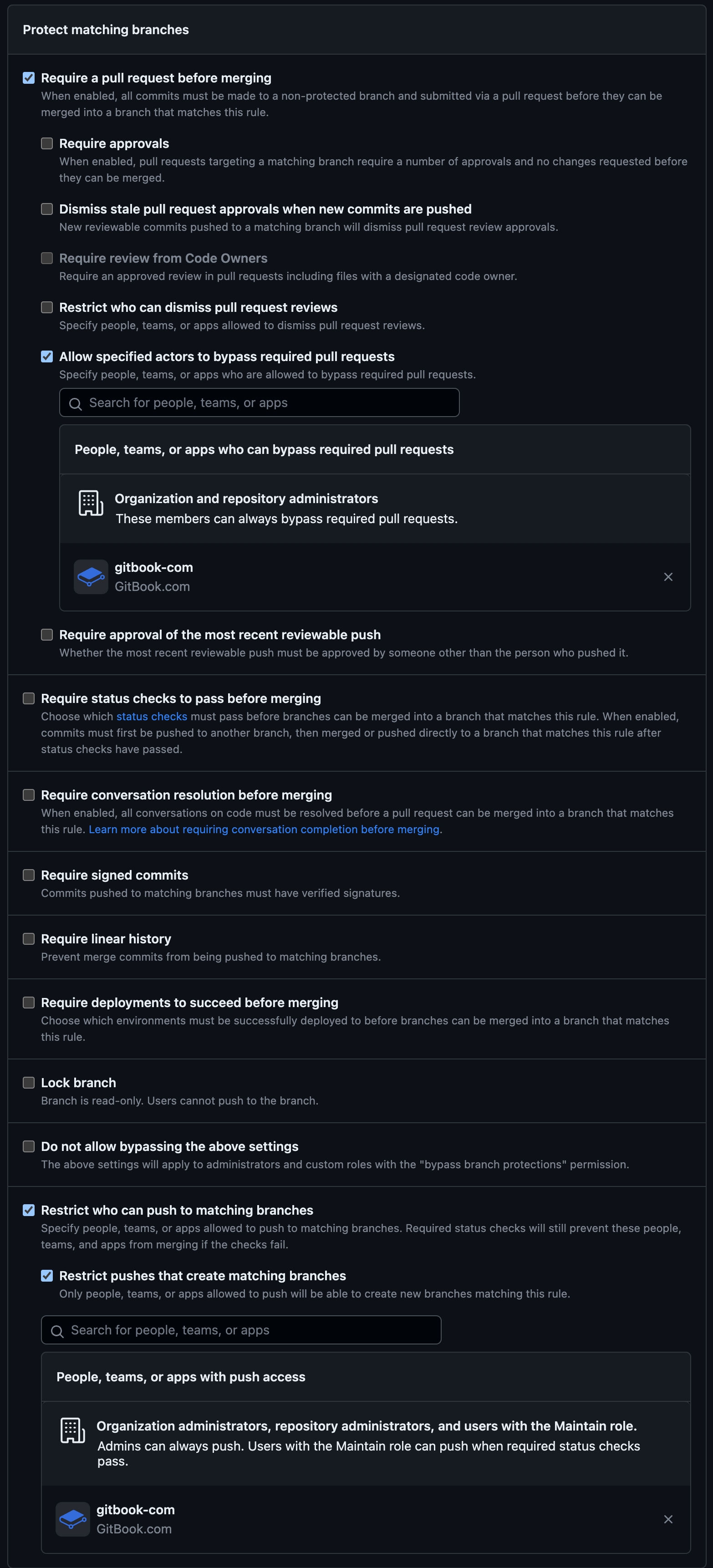 To do so, navigate to your settings in GitHub and allow gitbook-com to bypass those restrictions. The branch protections should look like this: